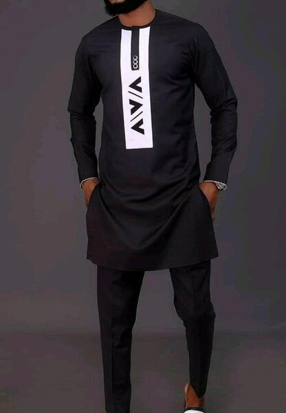 Tunique complet homme en coton manches longues de couleur noir brodée en blanc taille disponible L xL