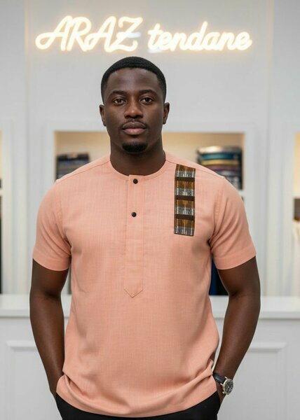 Tunique courte rose saumon homme. Tissu doux et élégant, col tunisien, poche style. Neuf, prêt à porter pour un look soigné.
