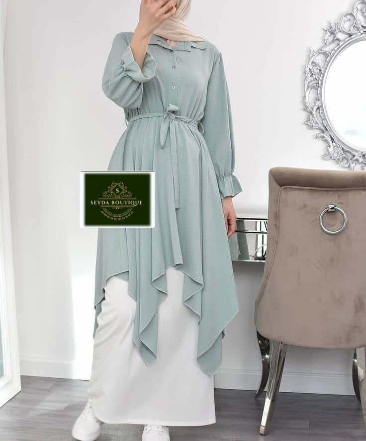 Tunique élégante en bleu pâle, parfaite pour un look raffiné et moderne. Avec sa coupe flottante et sa ceinture à nouer, elle s'adapte à toutes les morphologies. Idéale pour le quotidien ou des occasions spéciales, elle apporte une touche d'élégance à votre tenue.