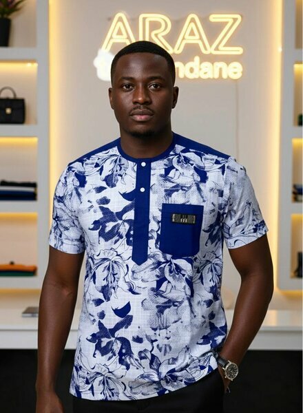 Tunique imprimé bleu/écru homme. Style décontracté, col bouton, tissu doux et confortable. Pièce chic, article neuf.