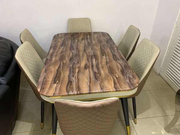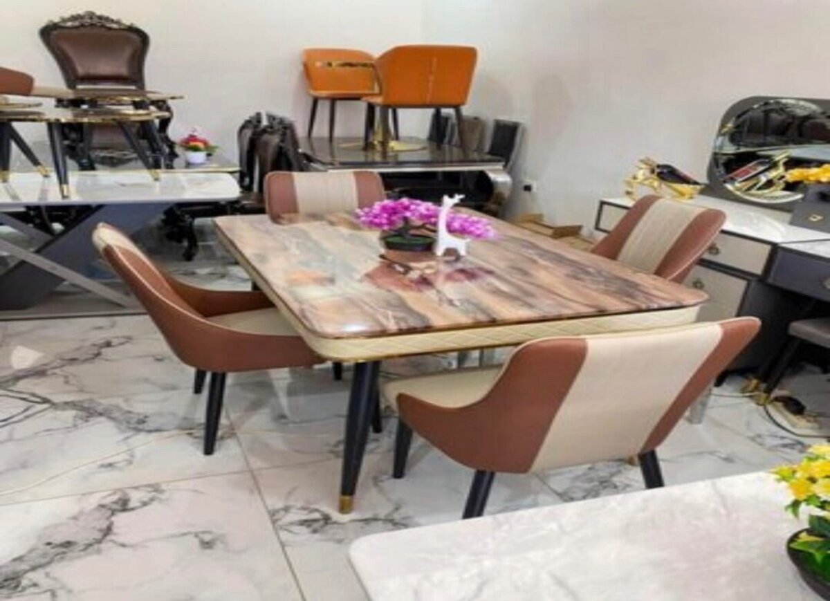 Chic dinning set features a stunning marble-look table paired with four stylish two tone two chairs