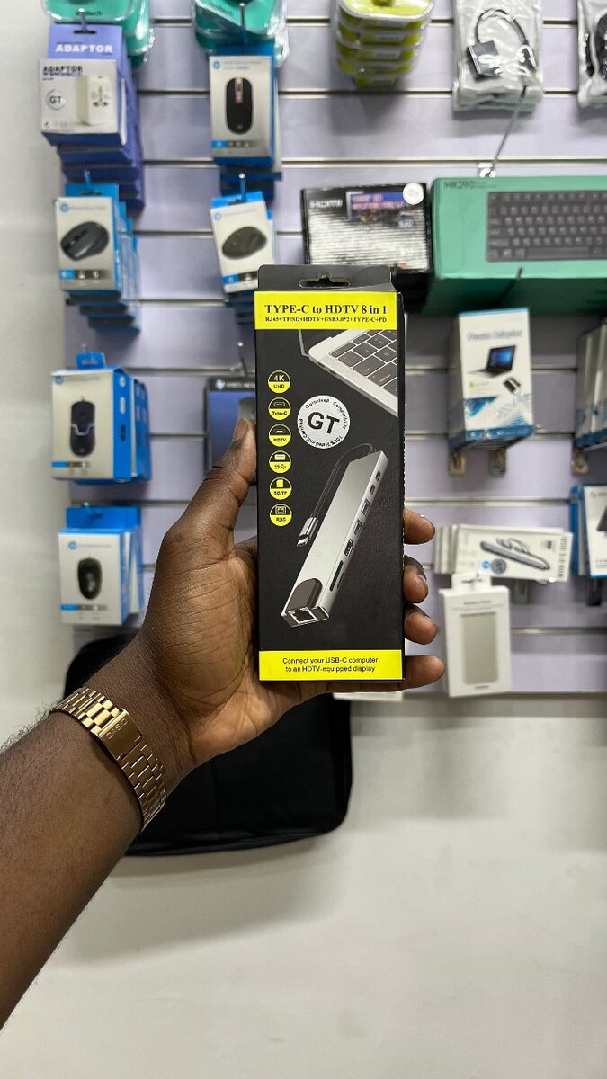 8 in 1 Type C hub; - Ethernet Port - 2 x USB Ports - 2 x Type C Ports - SD Card Slot - HDMI Port - Micro SD slot