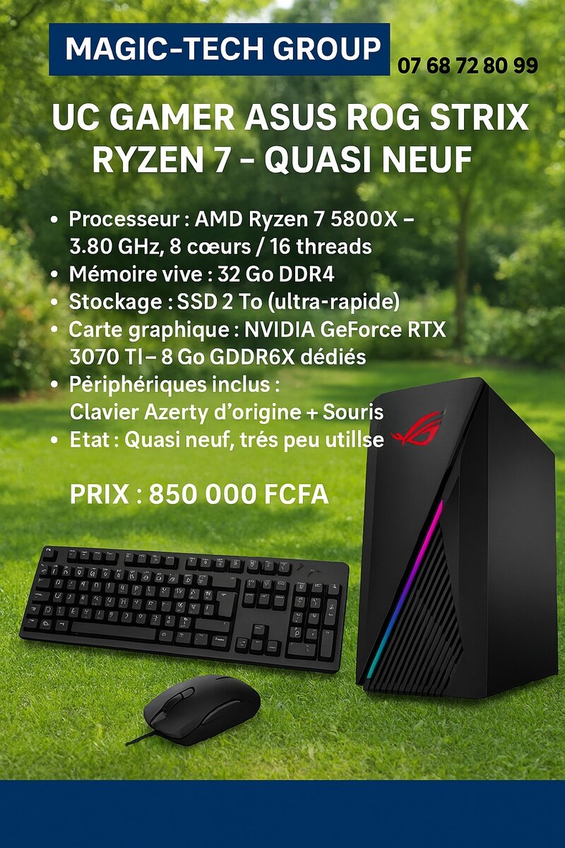 Découvrez la puissance du PC Gamer ASUS ROG Strix avec processeur Ryzen 7 5800X. Équipé de 8 cœurs, 32 Go de RAM DDR4, et carte graphique NVIDIA RTX 3070 Ti. Idéal pour gaming intensif. Quasi neuf, inclus clavier et souris.