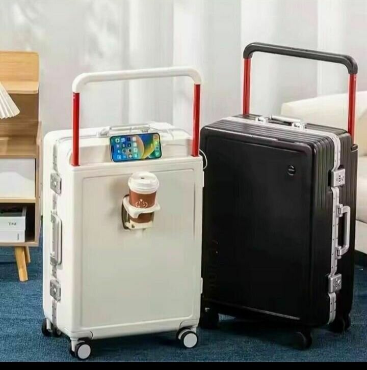 Valise trolley pratique et moderne, équipée d'un support pour téléphone et gobelet. Conçue pour les voyages, elle offre des fonctionnalités innovantes pour un séjour confortable. Disponible en noir et blanc.