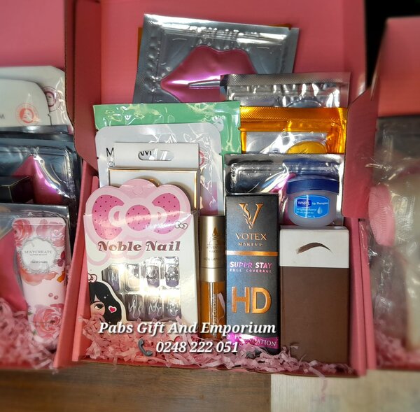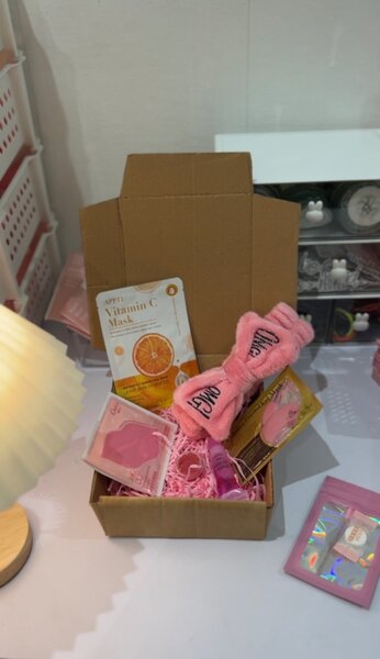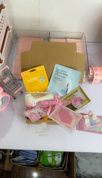This package comes with one collagen face mask(pink/gold), two random face masks,jade roller, one random omg headband, three mud masks, mask brush applicator,two random lip and eye masks, lip balm, one lip scrub (pink/strawberry), lip brush, two pieces of nose strips, one pack of acne patch and a double sided silicon face brush.