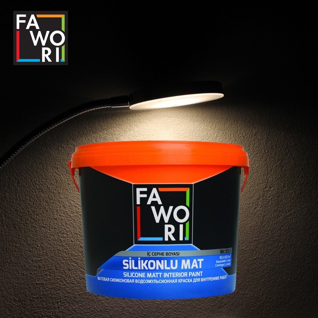 Силиконовая краска для стен и потолков. Матовая акриловая водоэмульсионная интерьерная краска Фавори в магазинах MURZA в городе Бишкек и Ош . Fawori Silicone mat создает матовый поверхность. Краска обладает водостойкостью, высокой укрывистостью и является высококачественным экономичным продуктом. Она прекрасно проникает на поверхность. Обладает высокой воздухопроницаемостью. Дышащий поверхность не держит влагу.