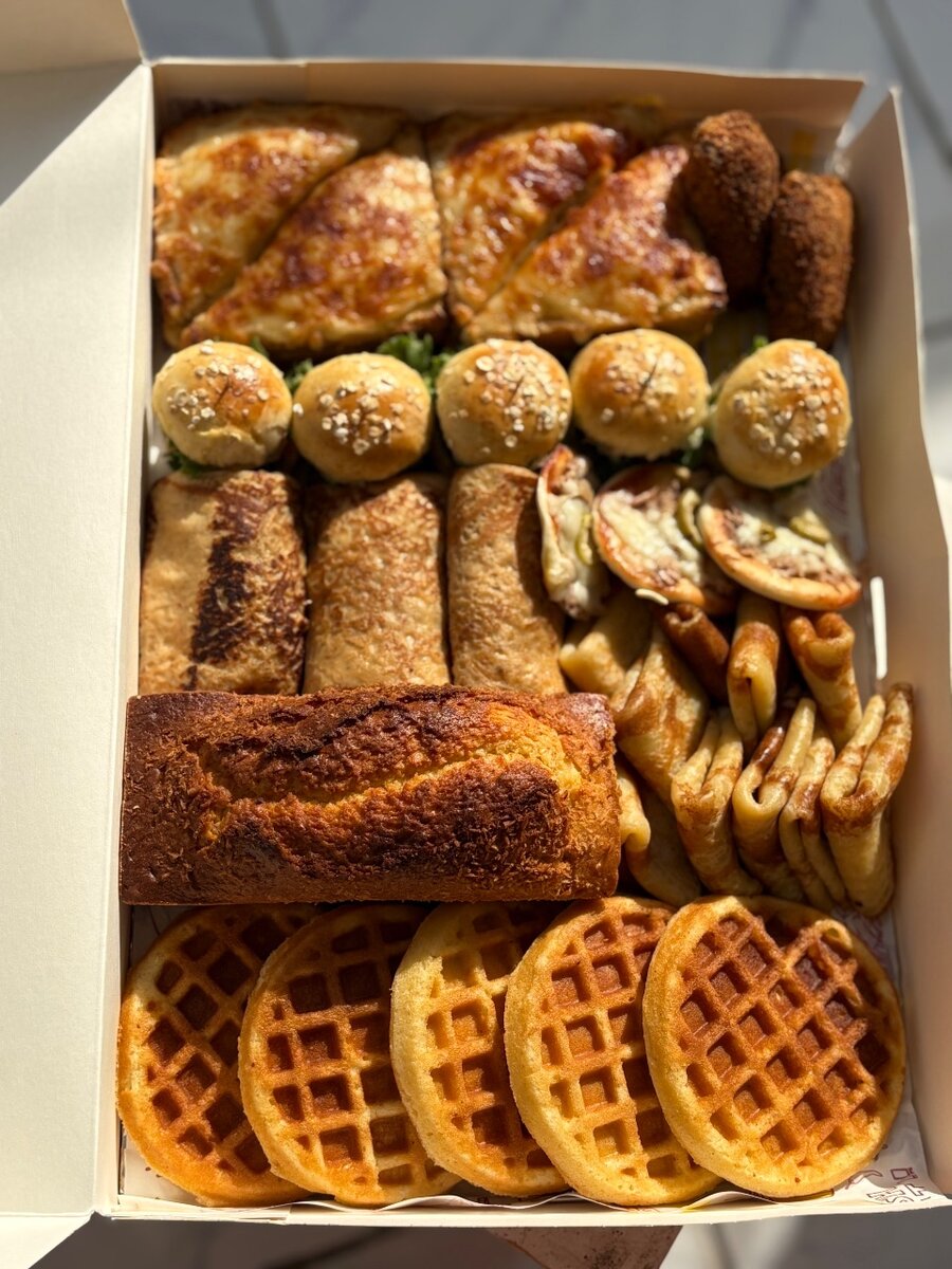 Boxe traiteur mixte . Contenue Gaufre , barre de cake , crêpes sucré, crêpes salé, mini burger, croque monsieur , mini pizza , aile de poulet pané Parfait pour les brunch entre amis , entre célibataire et en famille