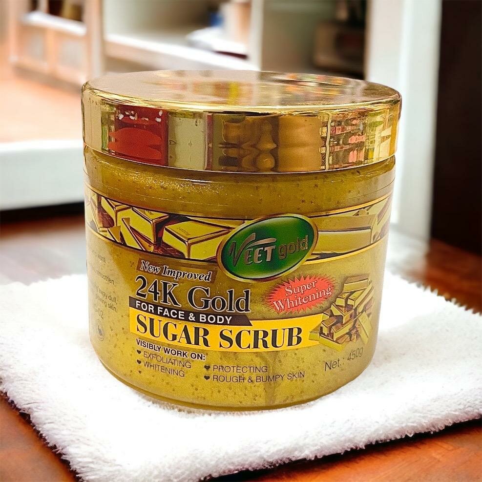VEET GOLD 24K GOLD SUGAR SCRUB Helps stimulate natural balance of skin cells without causing irritation Super lightening Deals with skin irritation Balancing the skin