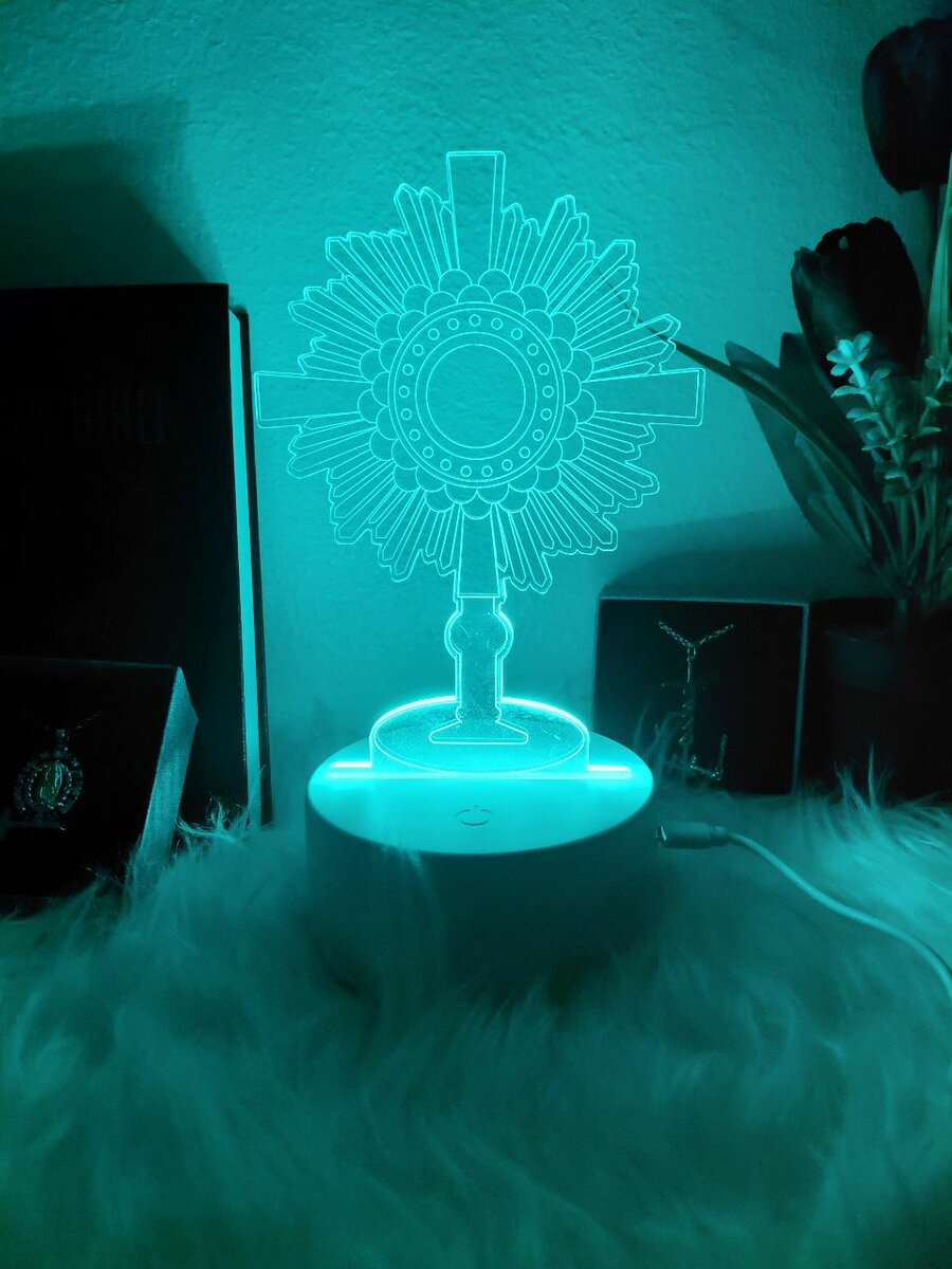 Éclairez votre espace avec cette veilleuse à l'effigie du saint sacrement . Parfait pour créer une ambiance apaisante dans n'importe quelle pièce. Connectivité Bluetooth intégrée pour bénéficier de musique sans fil. Idéale pour la maison, les chambres ou comme cadeau unique. Ajoutez une touche moderne et spirituelle à votre décoration.