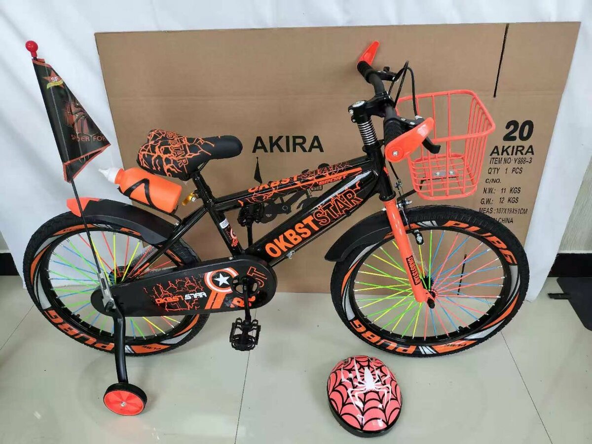 Vélo Akira 20 pouces pour enfants, design attrayant avec motifs colorés. Idéal pour les aventures en plein air. Équipé de stabilisateurs, drapeau de sécurité, panier pratique et casque assorti pour une sécurité maximale. Parfait pour les jeunes cyclistes.