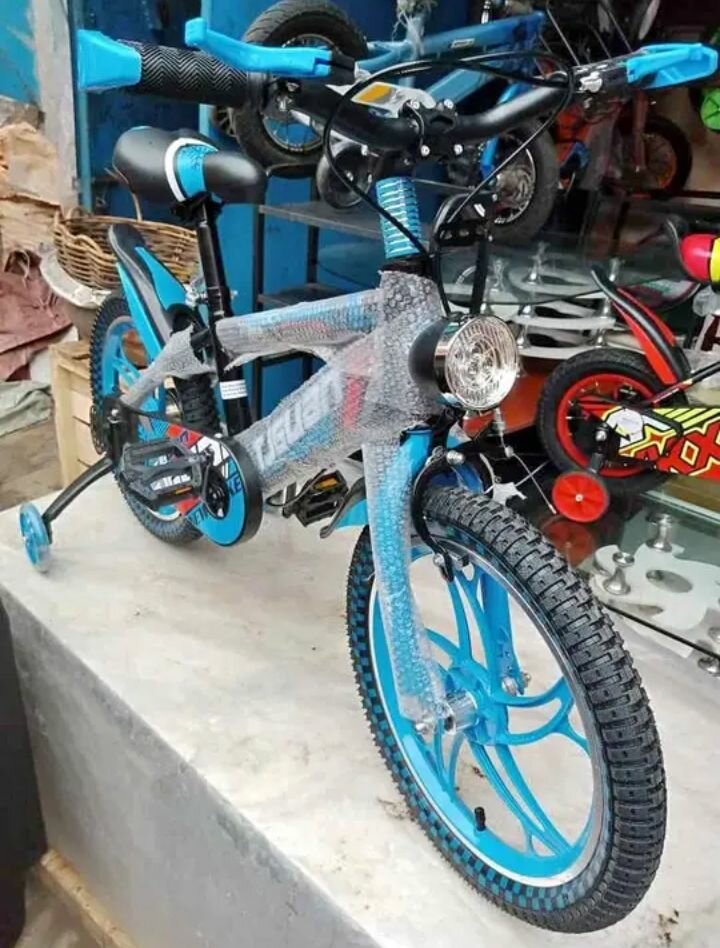 Vélo enfant Jaguar bleu avec roulettes de stabilité. Idéal pour apprendre à faire du vélo. Cadre robuste, freins sécurisés et design attractif. Parfait pour les jeunes aventuriers!
