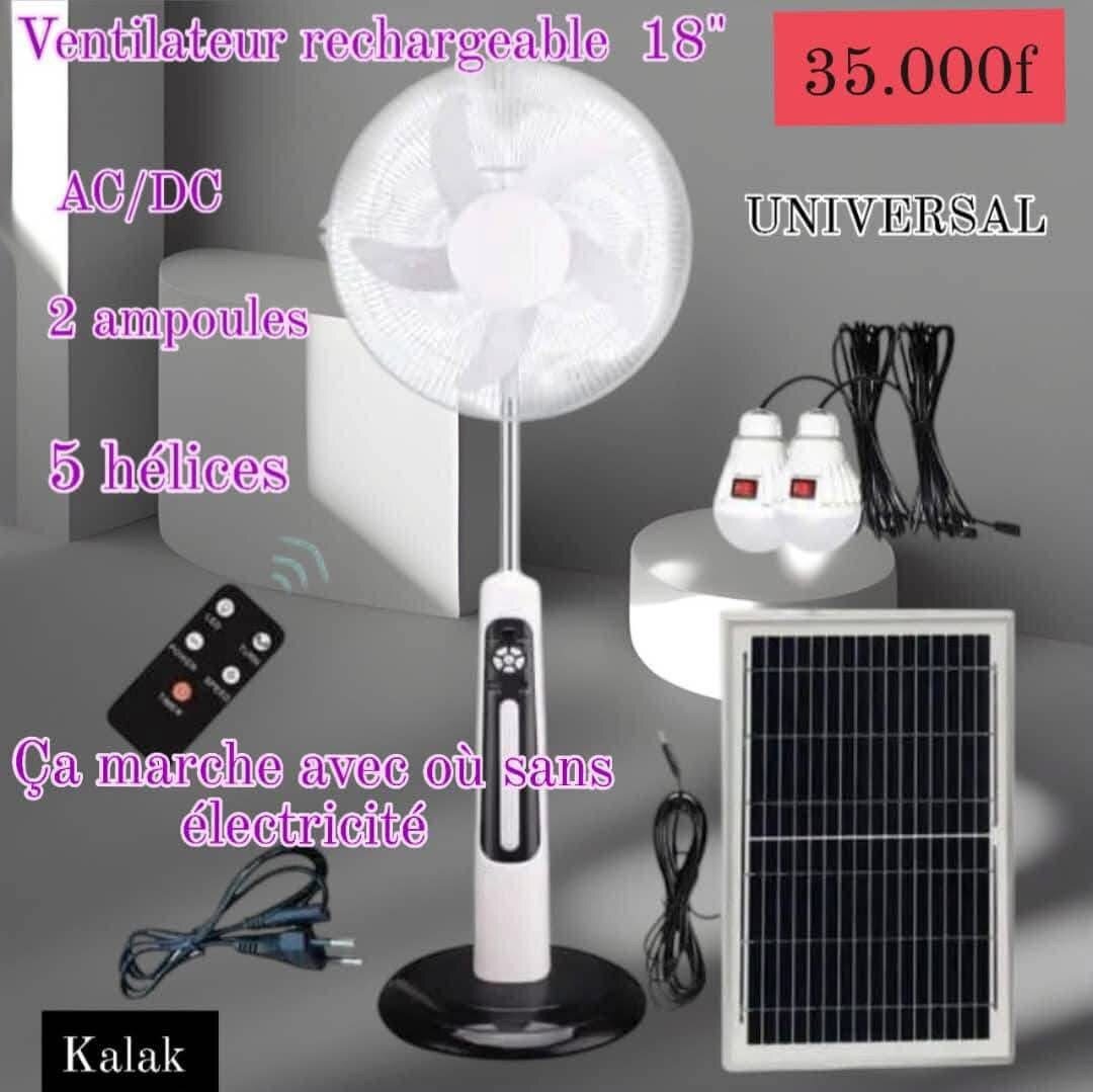 Ventilateur rechargeable 18'' avec panneau solaire pour une utilisation avec ou sans électricité. Équipé de 5 hélices, 2 ampoules et télécommande. Idéal pour la maison ou les espaces extérieurs.