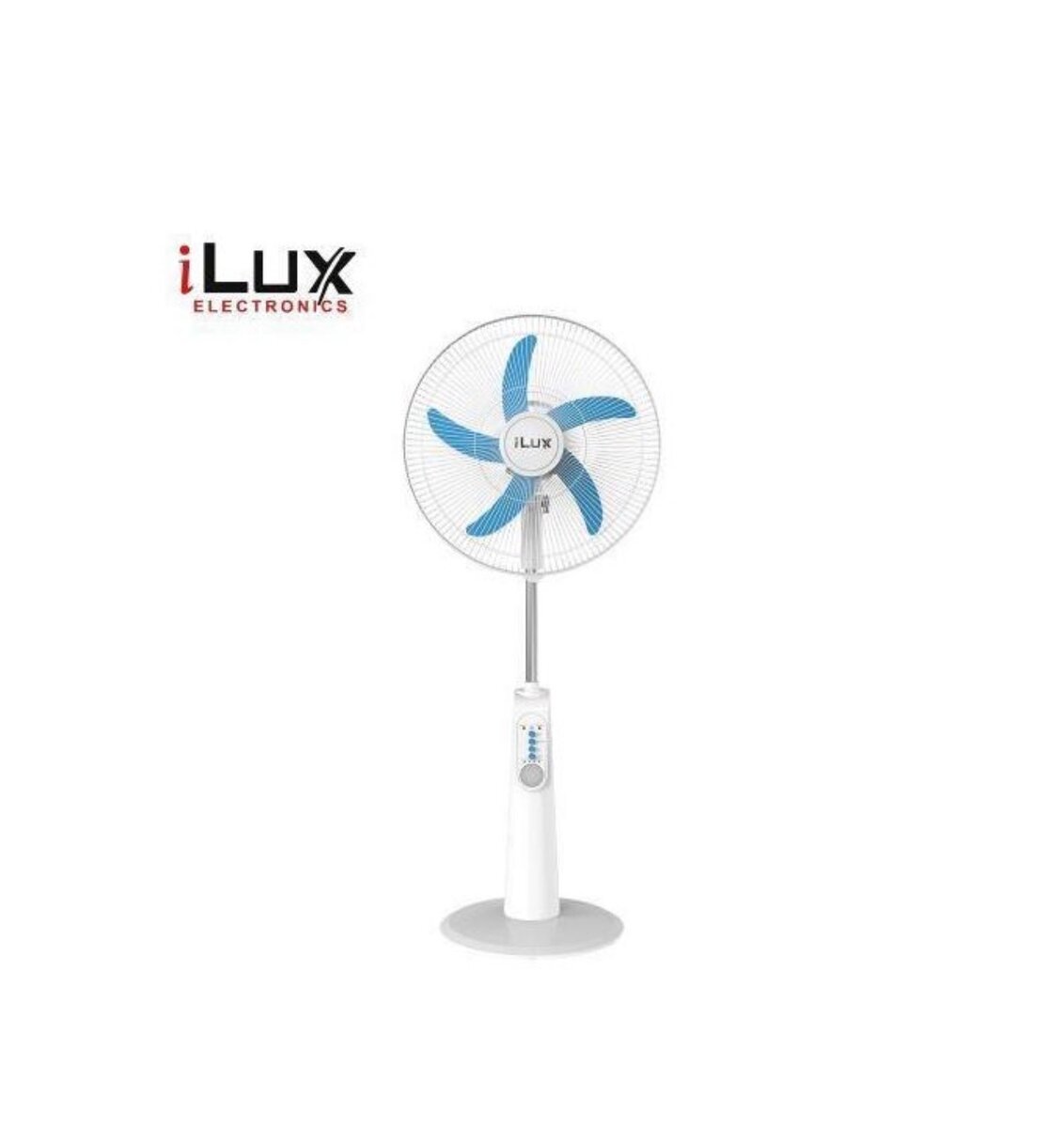 Ventilateur sur pied iLUX, idéal pour un rafraîchissement efficace. Design élégant avec 5 pales bleu et une hauteur ajustable. Parfait pour les chambres et bureaux.