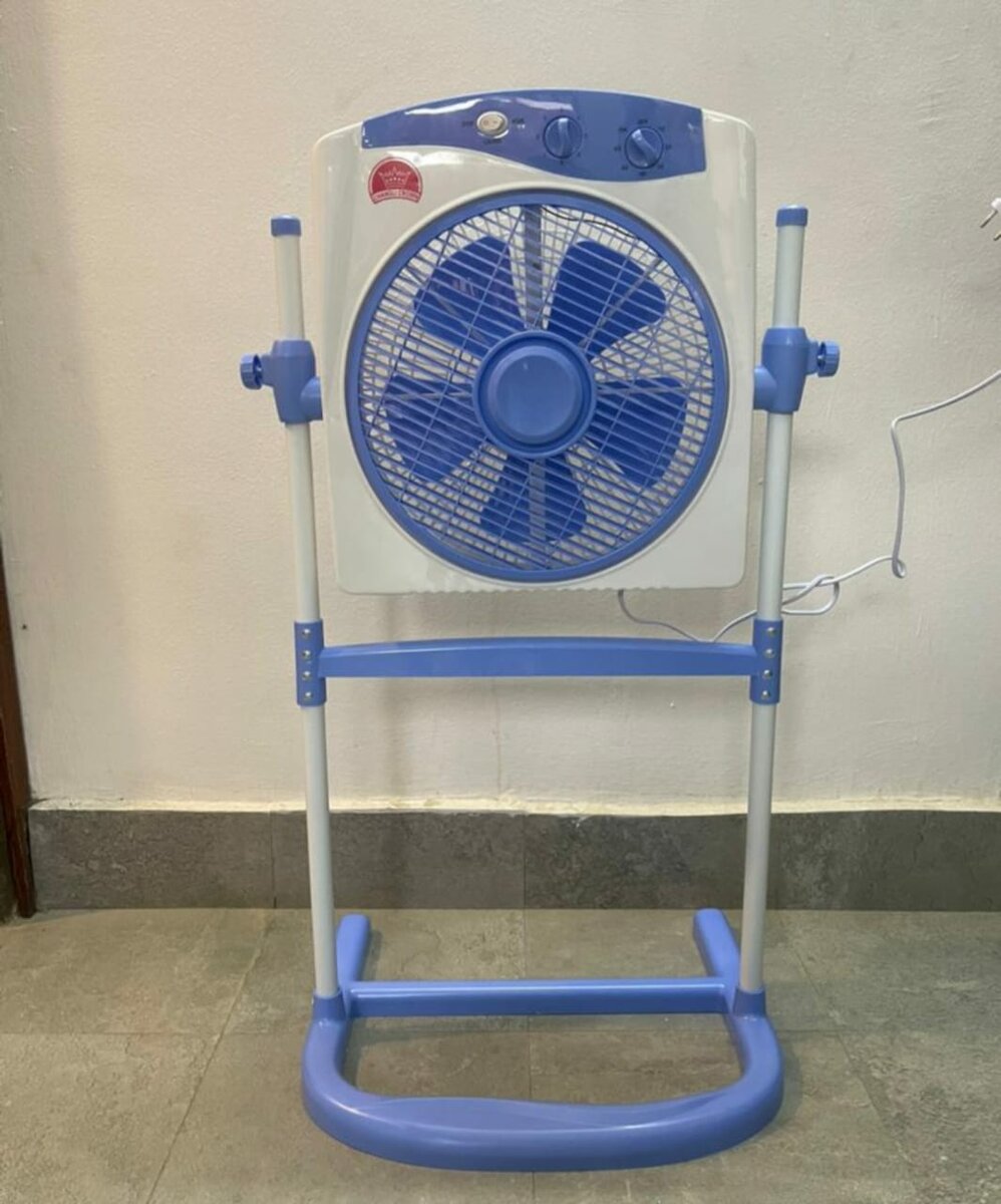 Ventilateur puissant sur pied avec hauteur réglable, idéal pour rafraîchir votre maison par temps chaud. Design bleu moderne, facile à déplacer et à installer, parfait pour toutes les pièces.