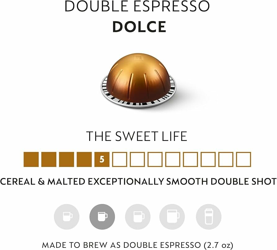 Une pause gourmande avec Nespresso vertuo DOUBLE ESPRESSO DOLCE Savourez un café riche et onctueux avec les capsules Nespresso Double Espresso Dolce. 80ml.