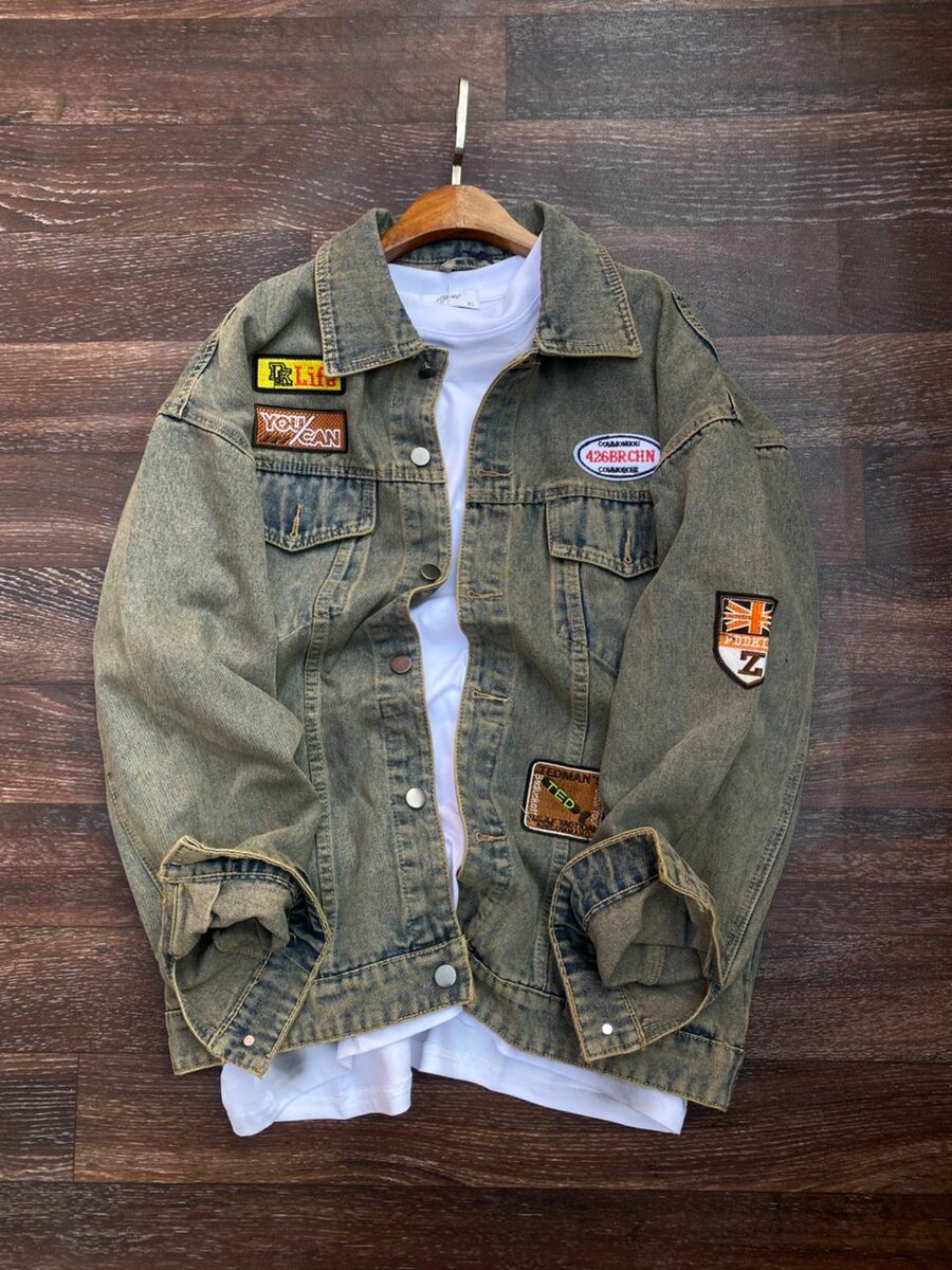 Veste en jean verte avec patchs pour un look unique. Idéale pour un style urbain et décontracté.