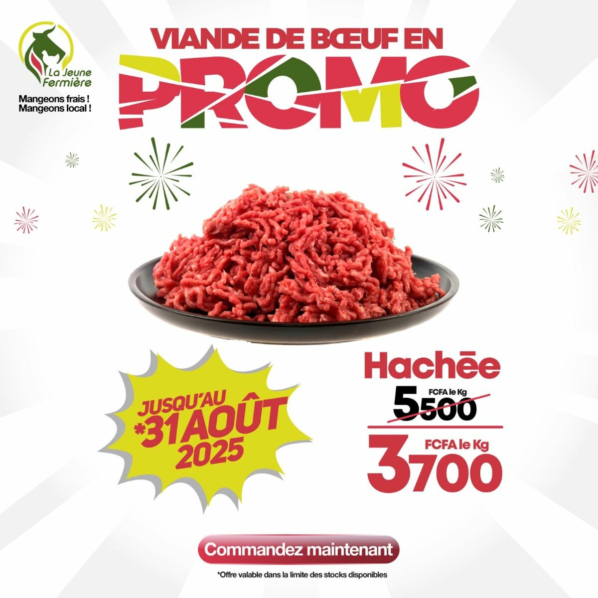 Ne manquez pas notre offre spéciale sur la viande de bœuf hachée jusqu'au 31 août 2025. Fraîche et locale, idéale pour vos plats savoureux.