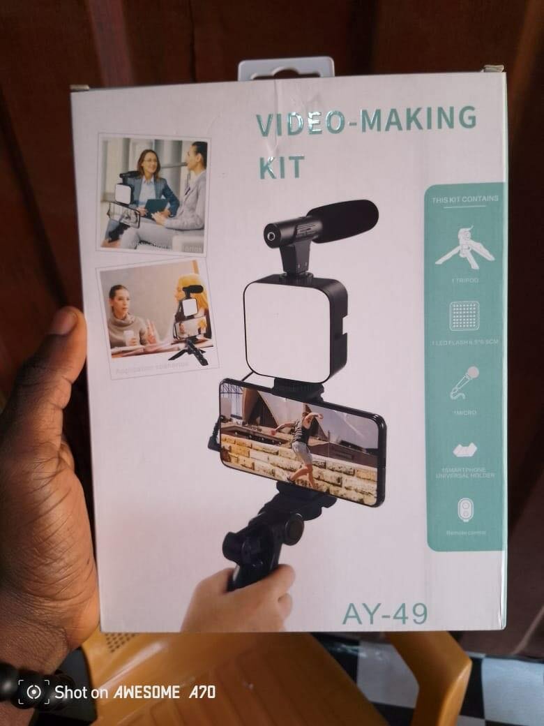 Video Making Kit comes with light, mic, remote, aux cable and phone stand