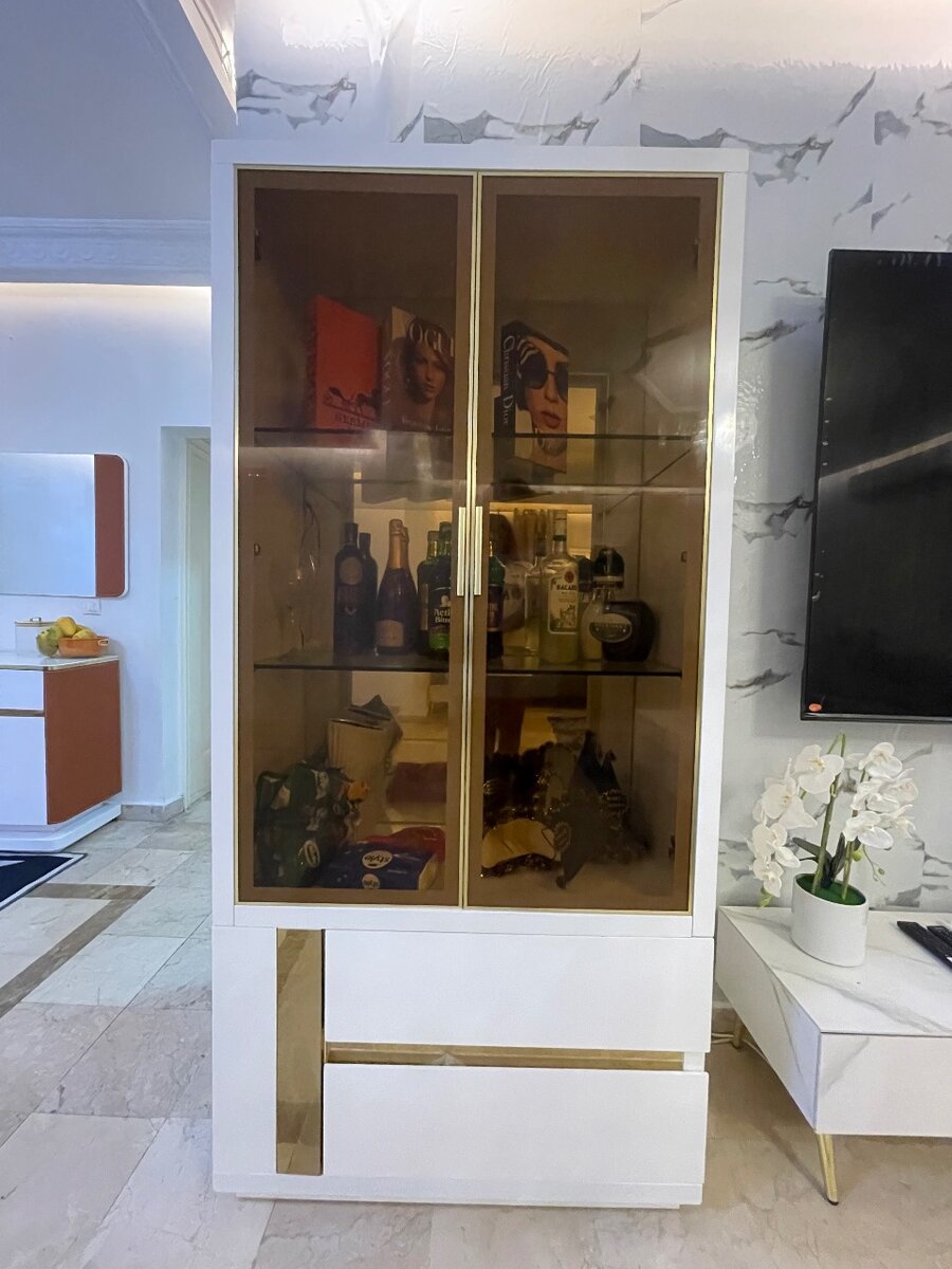 Vitrine moderne en verre avec étagères en bois élégantes. Idéale pour exposer vos précieux objets ou spiritueux dans votre salon. Avec son design épuré et ses portes vitrées, elle apporte une touche d'élégance à votre intérieur.