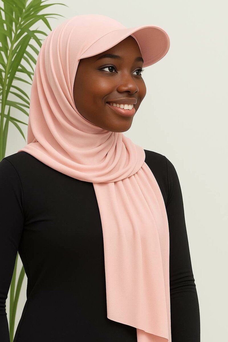 Élégant hijab en voile rose léger, parfait pour toute occasion. Design sportif avec casquette intégrée. Idéal pour un style moderne et confortable.