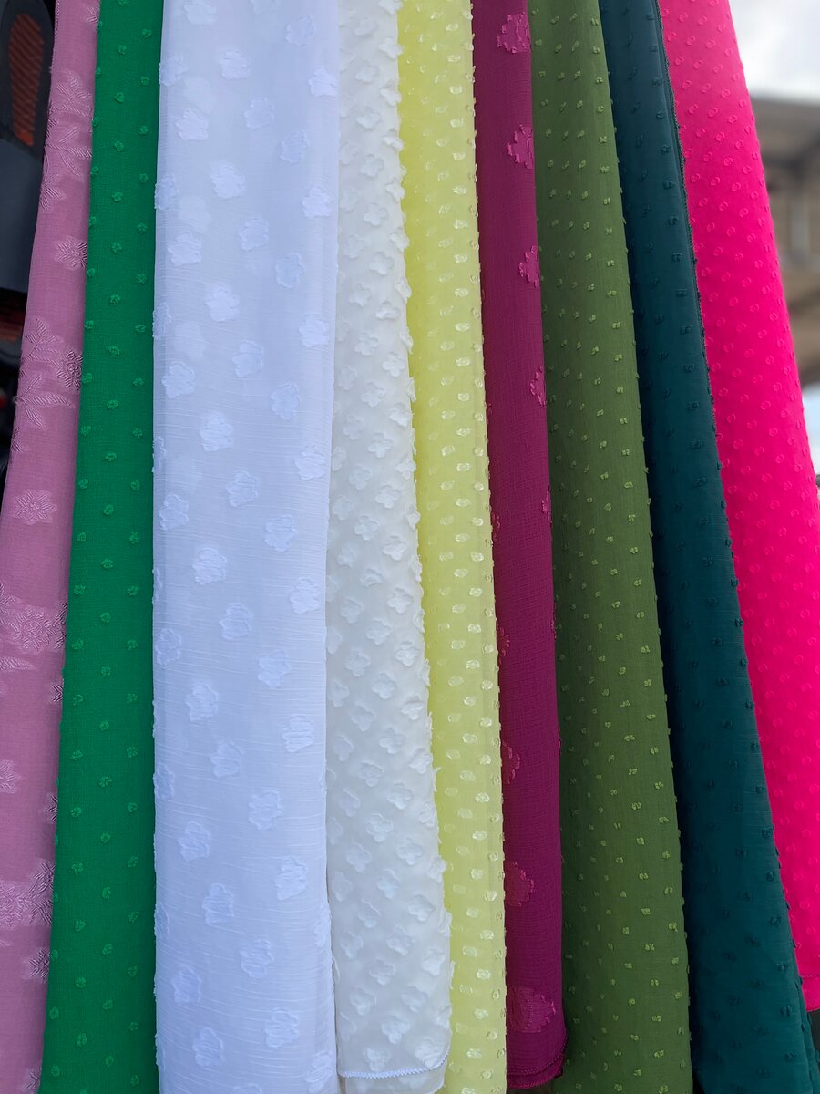 Découvrez notre superbe étoffe en chiffon, disponible dans une variété de couleurs vives et ornée de motifs fleuris délicats. Parfait pour la couture de vêtements élégants et accessoires de mode. Que ce soit pour créer des vêtements d'été légers, des foulards ou des robes tendance, cet tissu est idéal pour exprimer votre créativité !