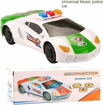 jouet de voiture de sport de police, principalement blanc avec des bandes vertes et des lumières de sirène colorées sur le toit.