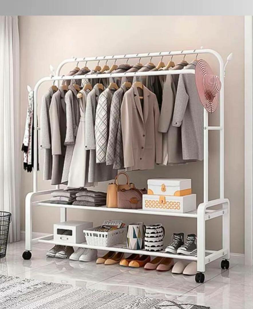 Изготовленная из металла или дерева, вешалка напольная обладает прочной конструкцией. Она оснащена штангой для верхней одежды, органайзером для обуви и палочками для мелких предметов.