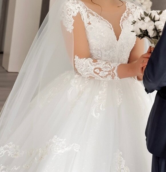 Покупали платье за $1000, фата $350, одевала 1 раз до первого антракта, невероятно красивое платье со шлейфом, которое можно удобно укоротить для первого танца молодоженов.