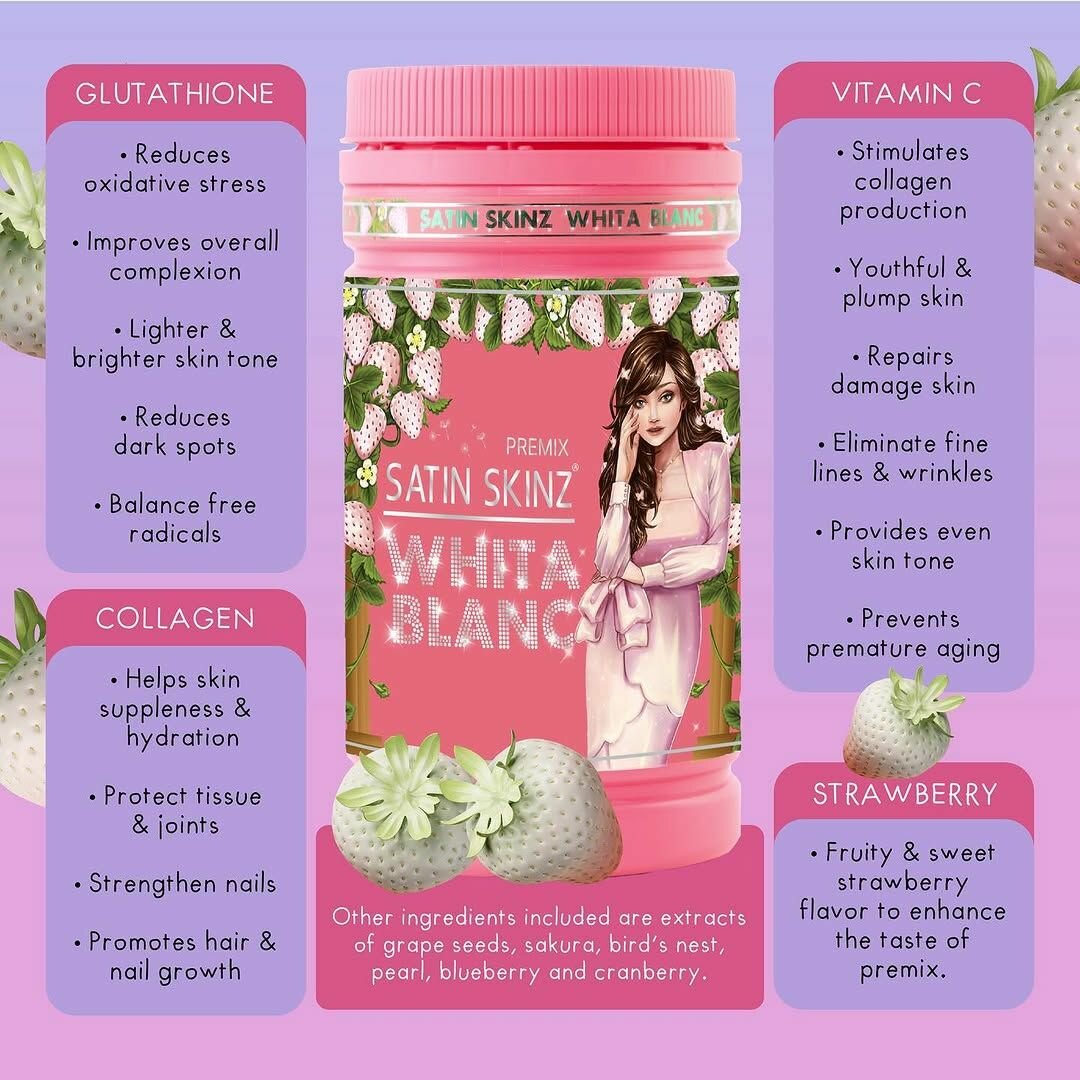 Satin Skinz Whita Blanc: Natural skin brightening supplement Supports even skin tone and radiance May reduce appearance of dark spots and hyperpigmentation Contains antioxidants and herbal ingredients Promotes glowing, healthy-looking skin