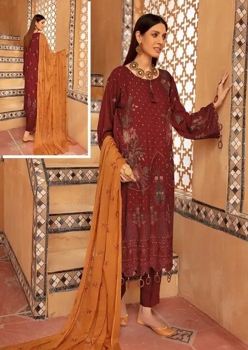 New Winter Fresh Arrival EMBROIDERED VISCOSE COLLECTION Viscose Embroidered Shirt Visocee Embroidered Sleeves Embroiderd Chiffon Dubatta Plain Matching Trouser