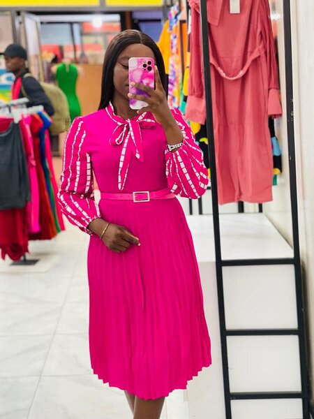 A yellow women's dress with an asymmetrical cut and a beige belt.