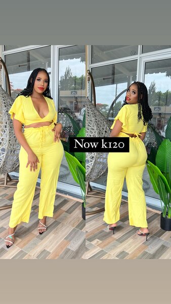 Yellow suit, trousers and a low-cut top