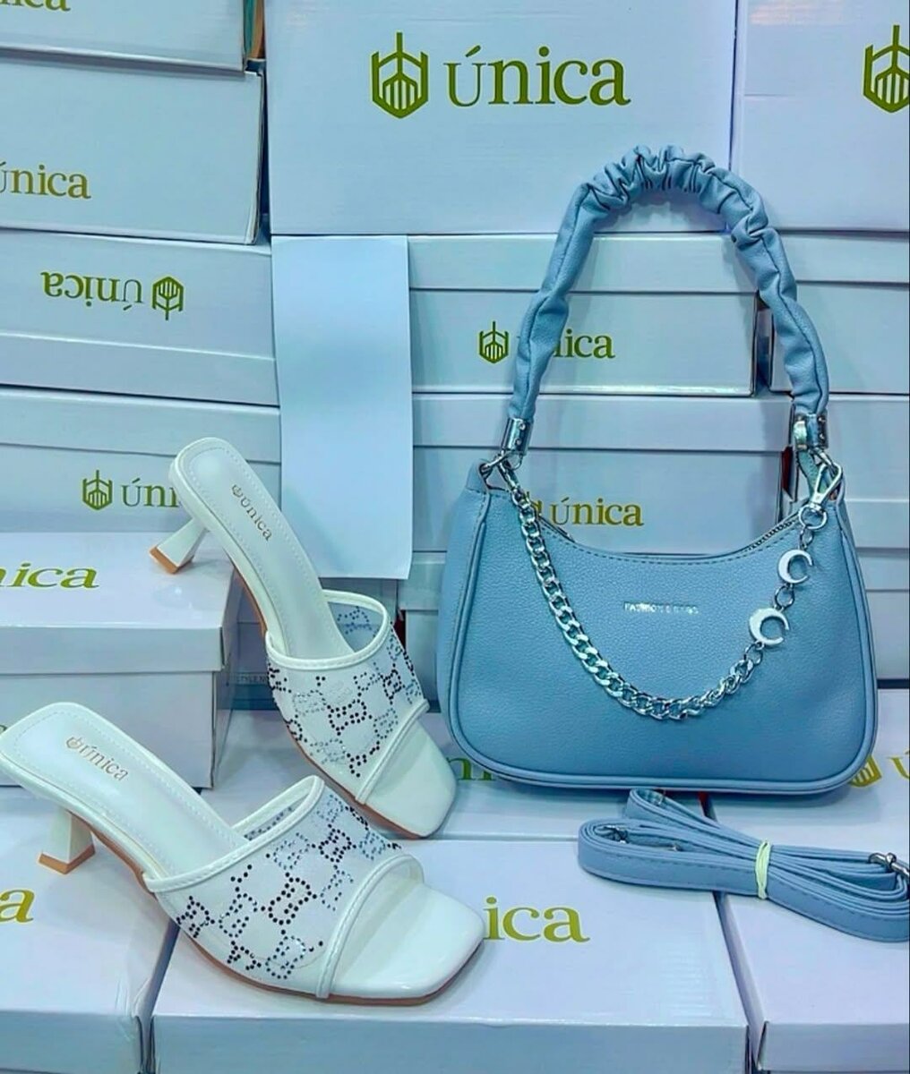 Enhance your style with this elegant handbag and sandal set. Featuring a chic handbag with a metallic chain accent and matching heeled sandals, this set is perfect for any occasion. Available in trendy colors to complement your wardrobe, ideal for both casual and formal looks.
