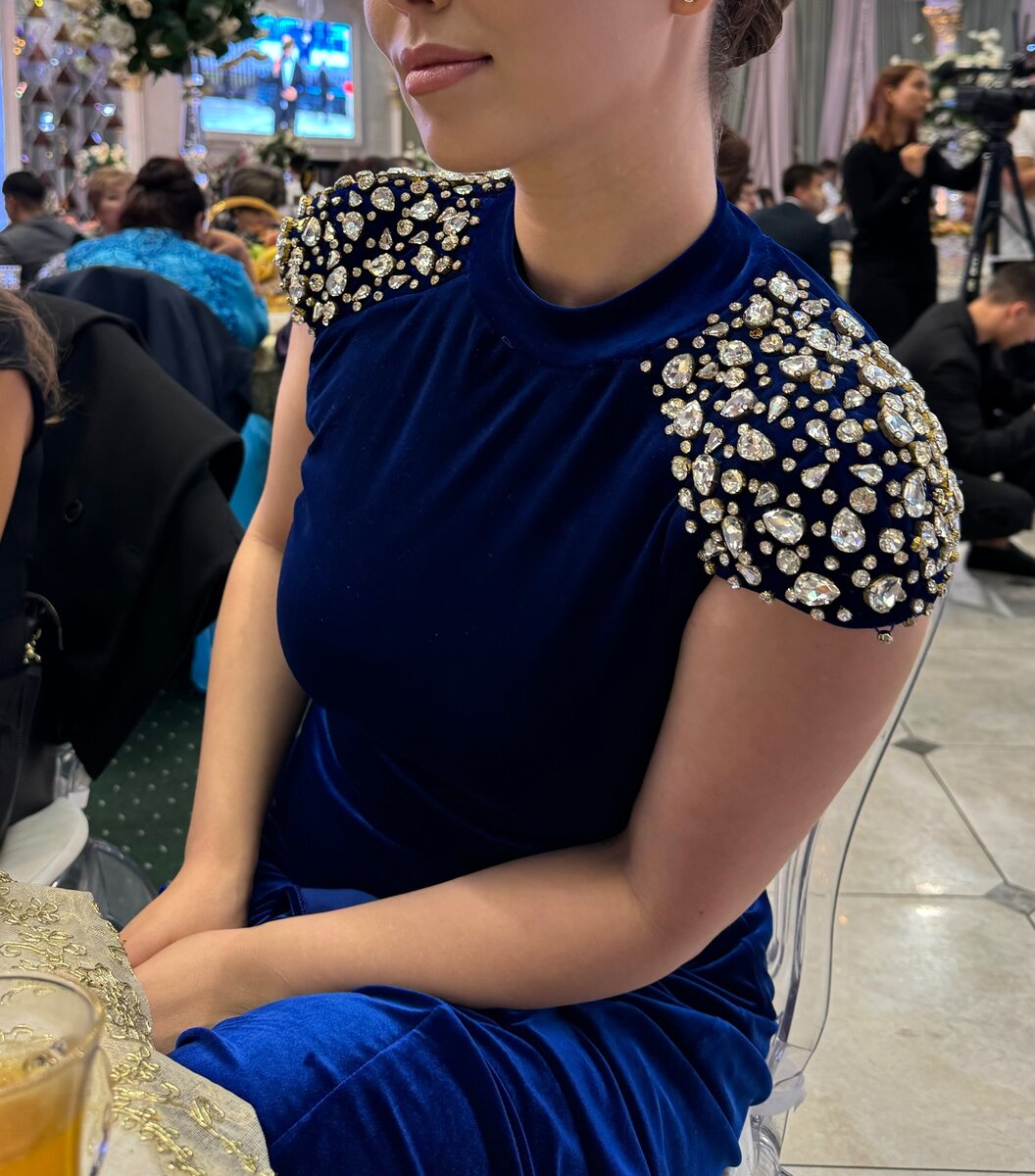 На плечах камушки. Цвет благородный электро,спинка аккуратно открыта , есть небольшой шлейф , аккуратный разрез на ноге