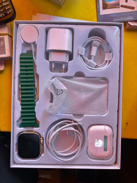 Comes with AirPod pro 2 ( second generation), wireless charger, type c charger, full screen smart watch, smart charger for watch, wireless power bank