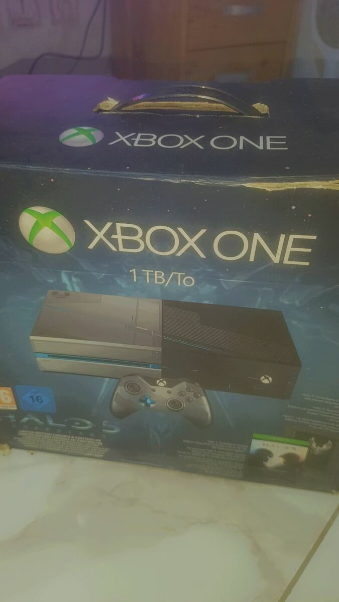 XBOX ONE, AVEC CARTON, GRAPHISME HALLO , UNE MANETTE , AVEC 7 JEUX , NB : LE CHARGEUR EST GÂTÉ SUITE AU COUPURE D'ÉLECTRICITÉ,