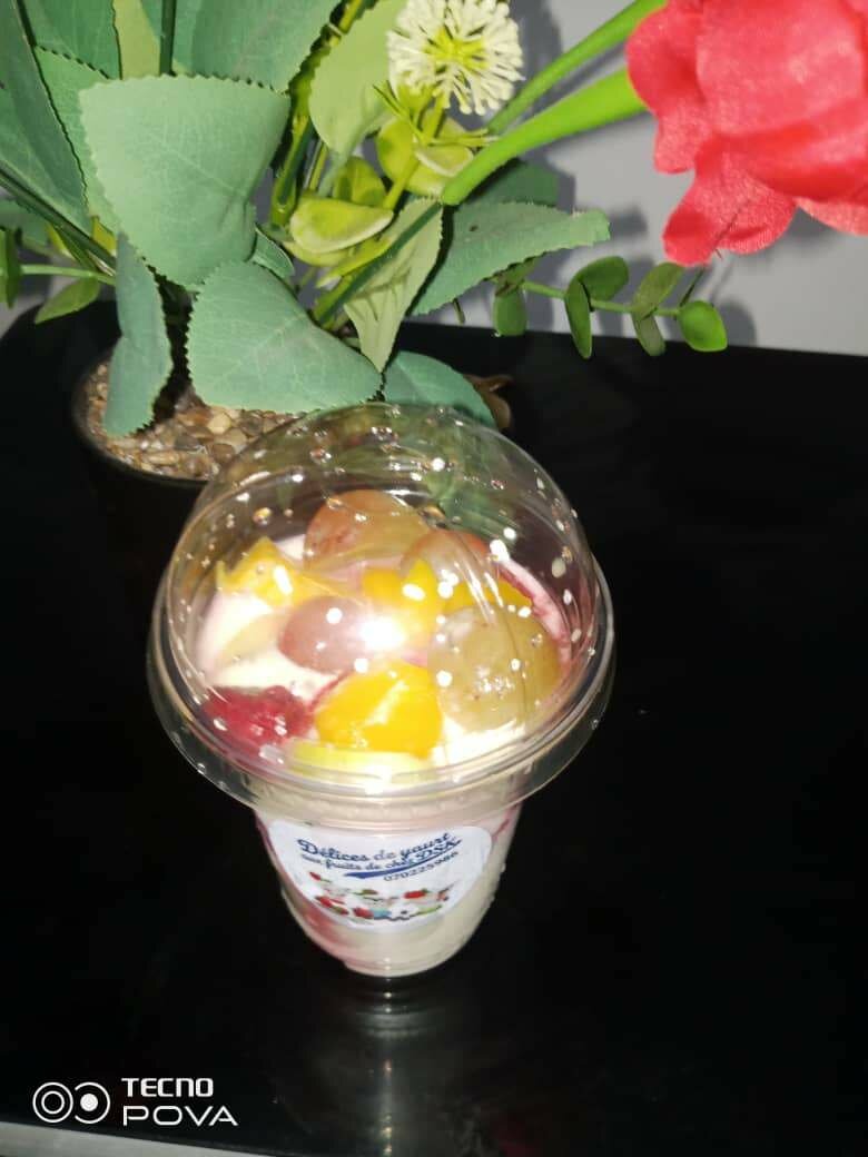 Yaourt crémeux avec des fruits : raisin fraise kiwi framboise pomme mangue ,frais