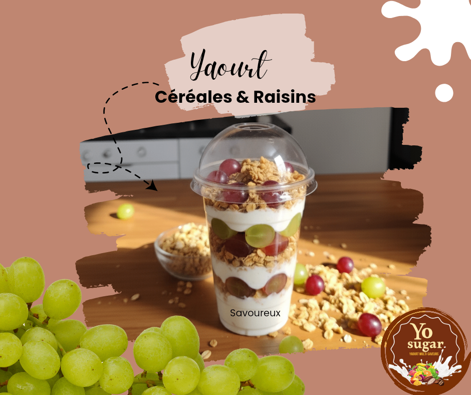 Dégustez un délicieux yaourt crémeux avec des céréales croquantes et des raisins juteux. Parfait pour un petit-déjeuner sain ou une collation nourrissante. Apportez une touche de fraîcheur à votre journée avec ce mélange savoureux et équilibré. Idéal pour les amateurs de gourmandises saines!