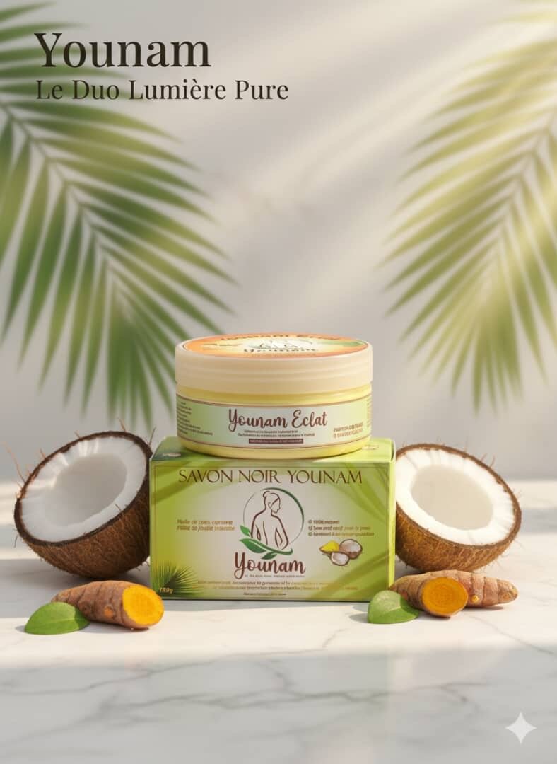 Notre Duo Eclat Naturel riche en Vitamine E, huile de coco, huile de curcuma, et bien d'autres huiles procure de la douceur, clarté, lutte contre les masques de grossesse, les acnés, vergetures, illumine et protège la peau au quotidien. C'est un allié sûre qui vous accompagne dans la réparation de votre peau abîmée par les produits. Nos produits sont naturels