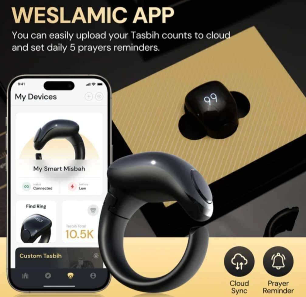 ZIKROMÈTRE, CHAPELET ÉLECTRONIQUE EN BAGUE, COMPTEUR 9999 FOIS, VIBRE, AFFICHE HEURE DE PRIÈRE, SE CONNECTE AU TÉLÉPHONE.