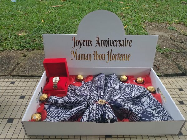 Coffret cadeau personnalisé anniversaire (tissu + montre + chocolat)
