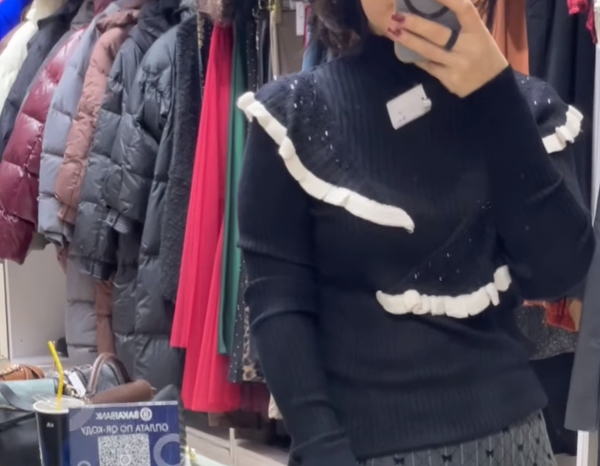 Ак руфлдер жана пайеткалар менен аялдардын кара трикотаж свитери